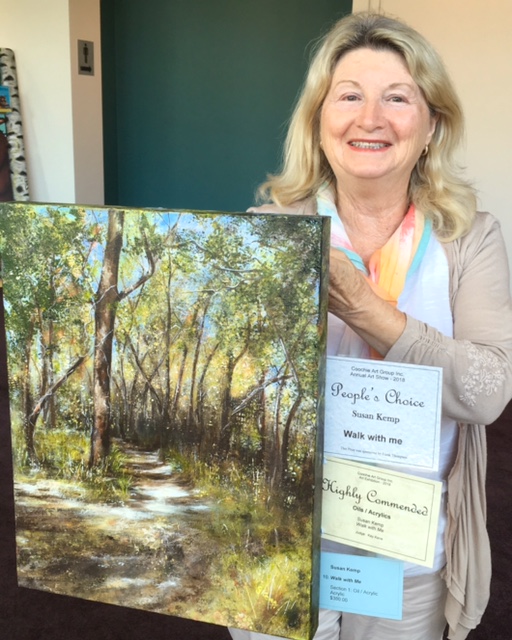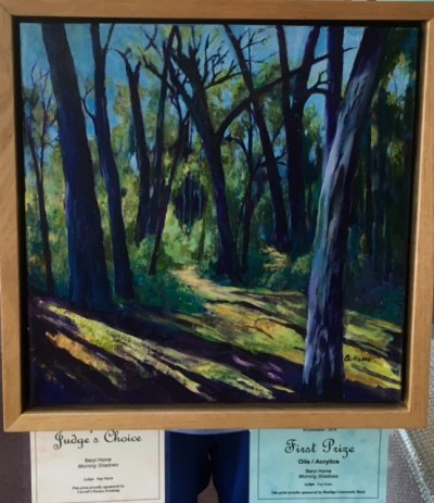 The Judge’s Choice prize in the 2018 Coochie Art Group Annual Art Sale and Show was won by Beryl Home’s wonderful painting “Morning Shadows”. It was also awarded First Prize in the OilAcrylics category. Well done Beryl and congratulations!