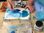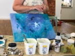 Once all texture and stencilling was dry, Hilary prepared a light version of one of the existing colours and prepared to paint the negative spaces around the flower silhouettes she had drawn. The paintings were not quite finished, but clearly showed what an effective technique this is. The more complicated designs certainly required lots of concentration! It was fun, thank you Hilary! You are such a generous tutor in every way.