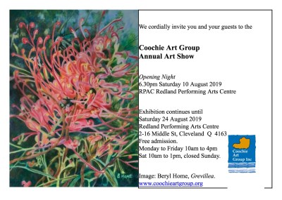 Coochie Art Group members are eagerly awaiting the Opening Night festivities of our Annual Art Show. Councillor Wendy Boglary will declare the Show open at 7.00pm on Saturday 10th August at Redland’s Performing Art Centre in Middle Street, Cleveland, opposite the Police Station. The Show has been hung and is looking fabulous! All are welcome, entry is free and refreshments will be served after the Opening.