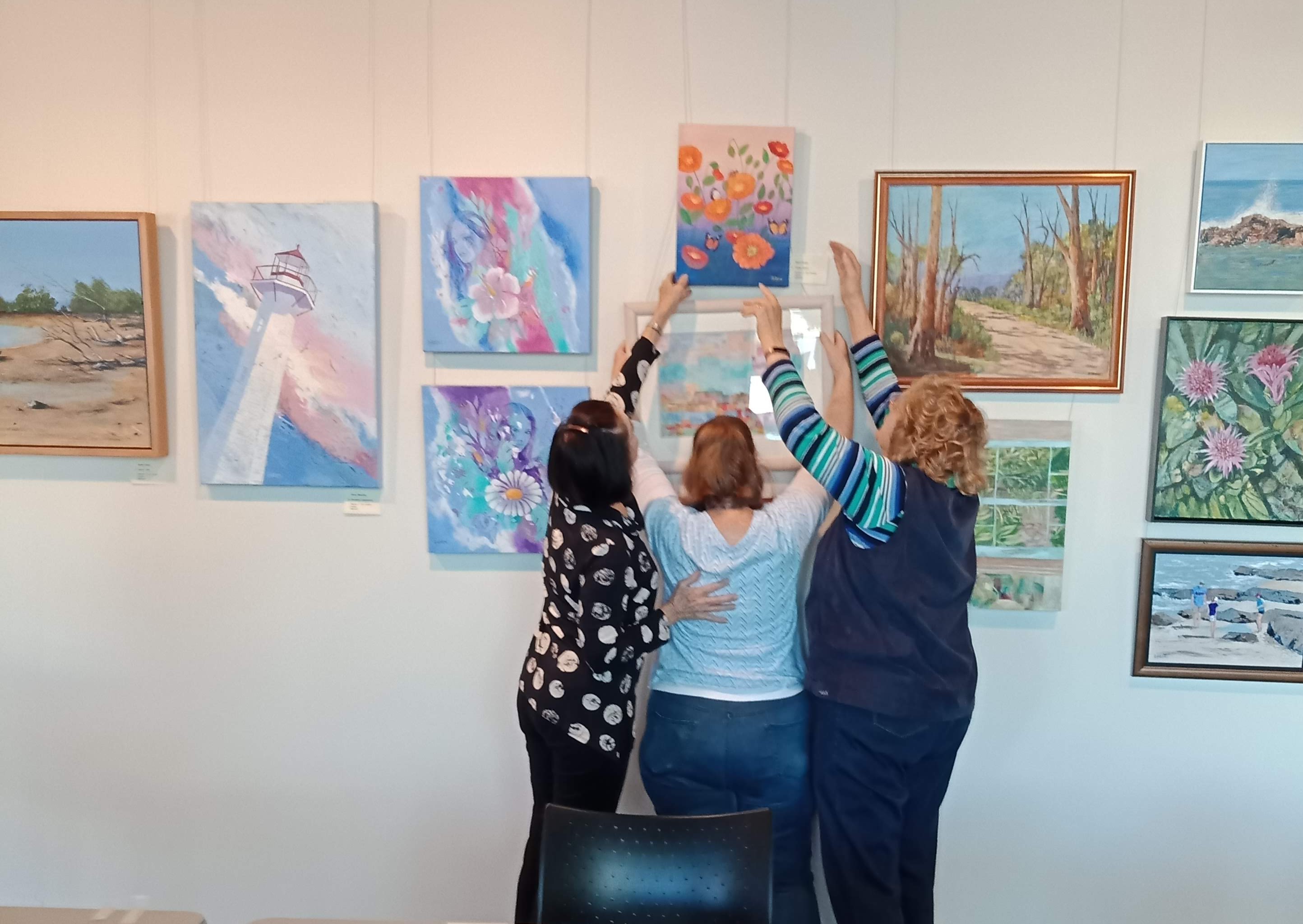 Members were fine-tuning the hanging today, while others took photos!!!! The Show looks great, with a wide variety of genre and media. CAG’s beautiful hand-painted cards will be for sale. The First Prize for our raffle will be a choice between 2 wonderful paintings by Master Pastellist Penny Gilbert-Ng and local, prizewinning wild life artist Louise Saunders. The hardest part will be which painting to choose!